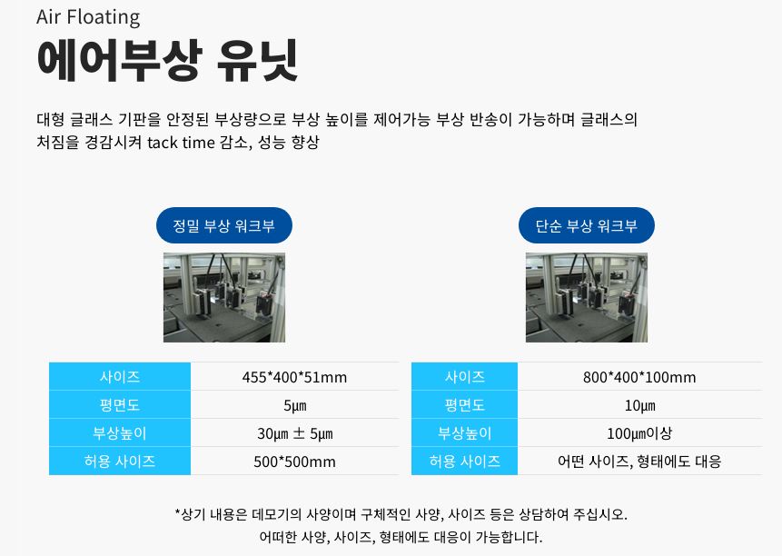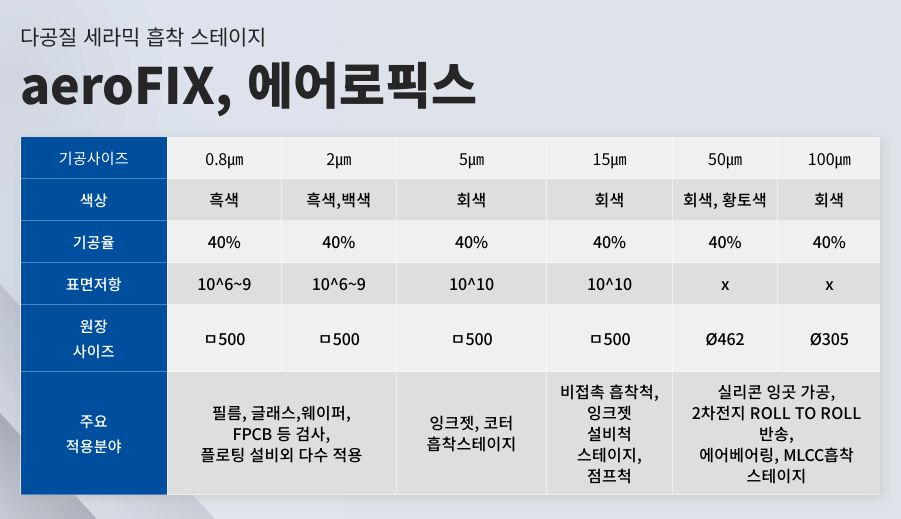 특히 당사의 독자적인 세라믹 소결 기술로 탄생시킨 다공질 세라믹 에어로픽스 "aeroFIX" 를 적용한 제품들은 LCD, PDP, PCB, 반도체, 태양전지, 전자인쇄 분야 등 거의 모든 국내외 첨단 산업 분야에 적용되어 많은 호평을 받고 있습니다.