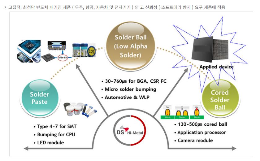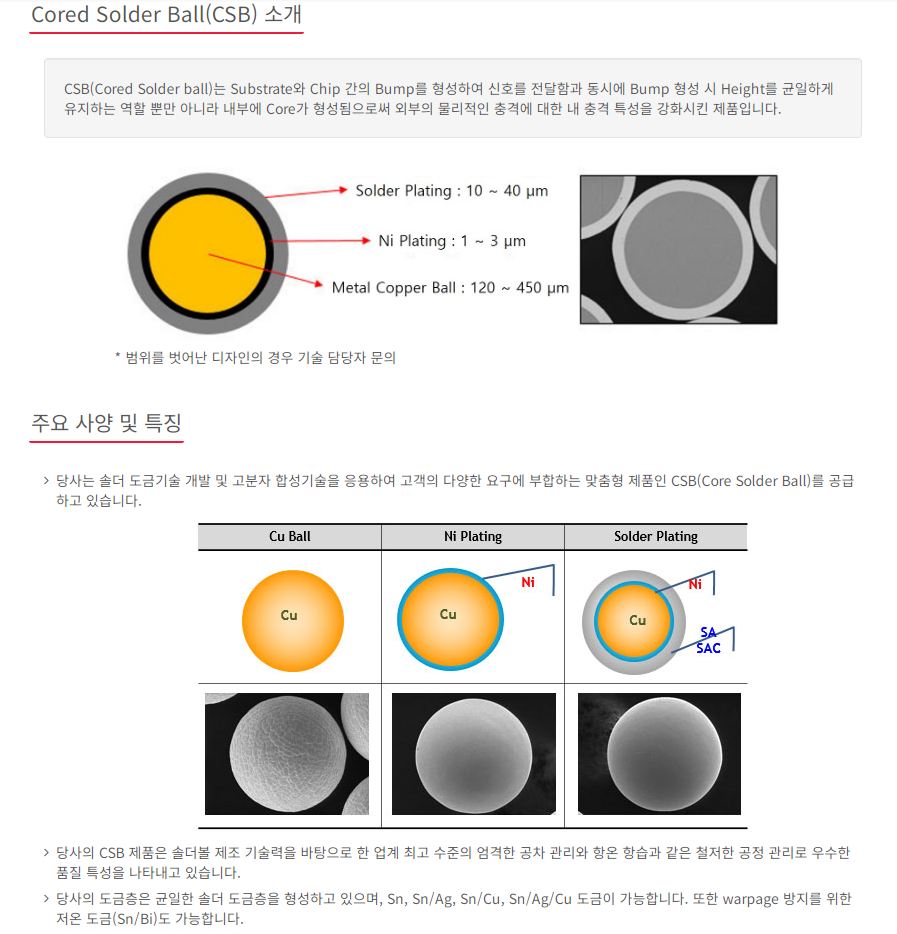 Ball), CSB 등의 제품을 선보이며 글로벌 시장에서 점유율 1~2위를 기록하는 등 소재 산업 발전에 기여하고 있습니다. 또한, 솔더 파우더(Solder Powder), 플럭스(Flux)를 포함한 다양한 페이스트 제품군을 보유하고 있으며, 2002년 기술연구소 설립 이후 차세대 소재 개발을 위한 R&D 투자를 지속하고 있습니다.