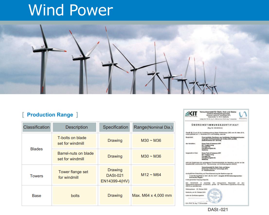 KPF의 화스너 제품은 오랜 시간 축적된 기술력과 풍부한 경험으로 우수한 품질을 갖추고 있습니다. 열간단조 공정과 냉간단조 공정을 통해 다양한 사이즈의 생산이 가능하며, 열처리, 도금 등 고객이 요구하는 스펙을 충족시키기 위해 노력하고 있습니다. 건설용, 석유화학 플랜트용, 중장비용, 풍력용 등 다양한 제품을 생산하여 국내는 물론, 세계 주요 프로젝트에 참여함으로써 그 입지를 더욱 굳혀가고 있습니다.