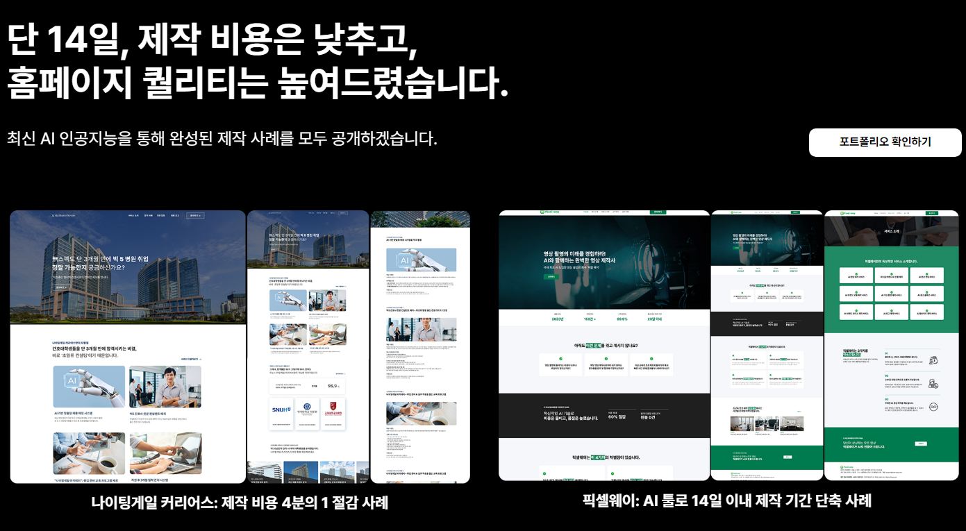 단 14일, 제작 비용은 낮추고, 홈페이지 퀄리티는 높여드렸습니다. 최신 AI 인공지능을 통해 완성된 제작 사례를 모두 공개하겠습니다.