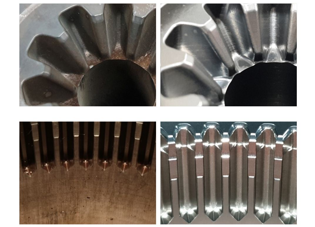 NOVA 연마재는 정밀성을 요구하는 감속기어를 친환경적으로 빠르고 정밀하게 가공할 수 있습니다. 일반적으로 금속가공은 화학연마, 전기연마, 숫돌 또는 액체호닝의 과정을 거쳐 표면가공, 슈퍼피니싱의 결화물을 만들어 내는데 이 과정에서 화학산업 폐기물과 분진이 발생하며 환경에 영향을 주고 작업자의 작업환경을 위험하게 하는 요소가 됩니다.