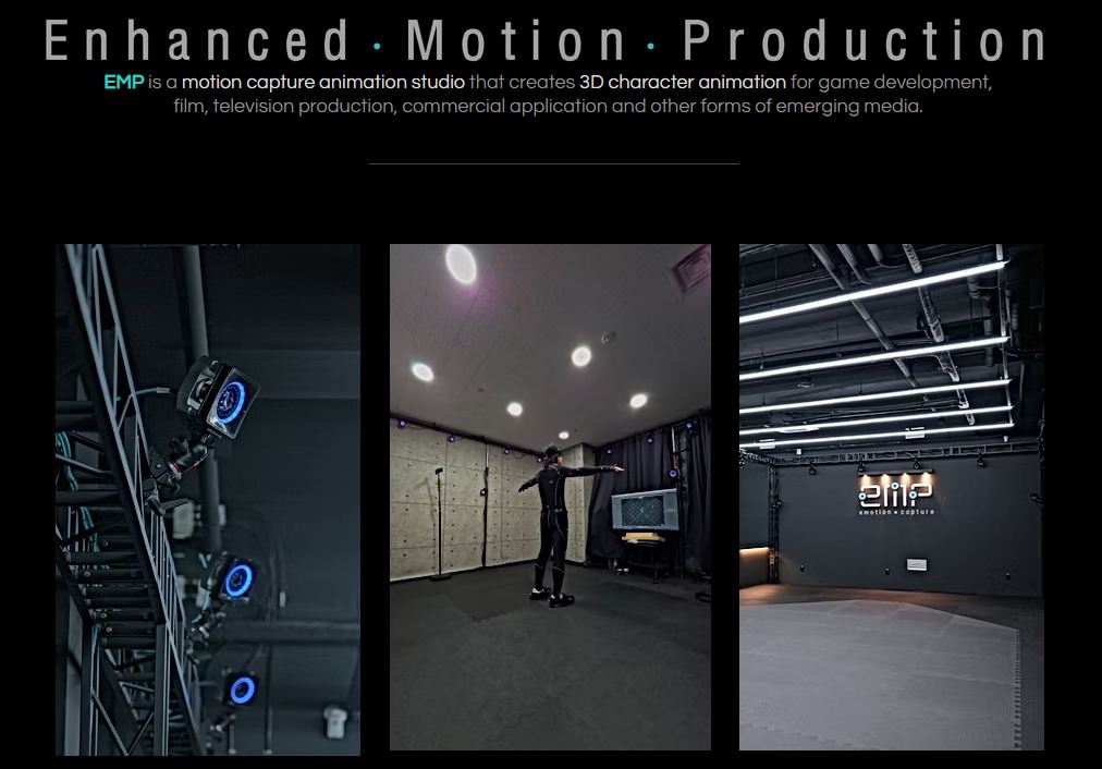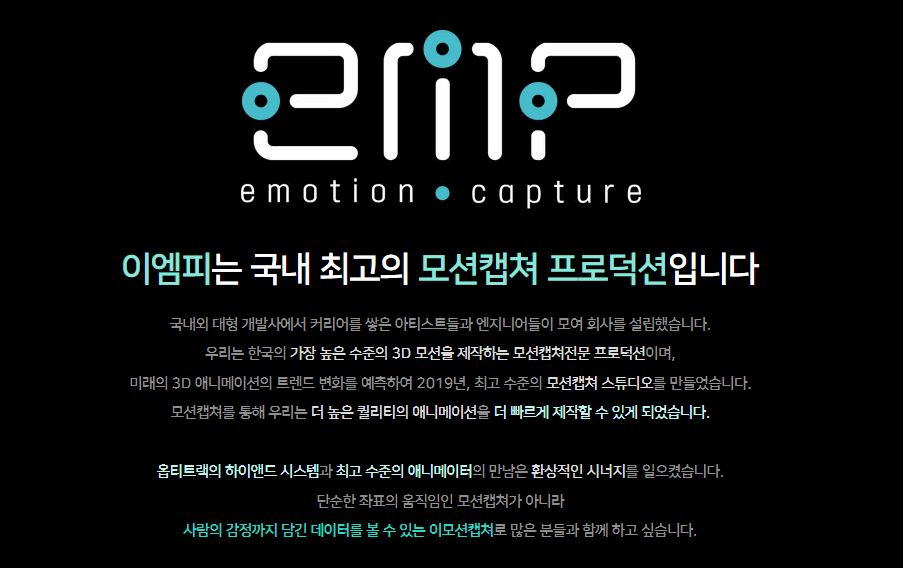 저희 회사는 국내 최고의 모션 제작 스튜디오인 이엠피 스튜디오를 산하에 두고 있습니다.