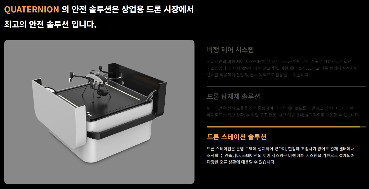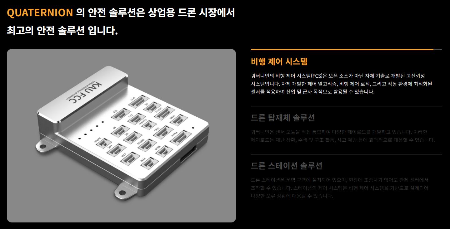 쿼터니언의 비행 제어 시스템(FCS)은 오픈 소스가 아닌 자체 기술로 개발된 고신뢰성 시스템입니다. 자체 개발한 제어 알고리즘, 비행 제어 로직, 그리고 작동 환경에 최적화된 센서를 적용하여 산업 및 군사 목적으로 활용될 수 있습니다.