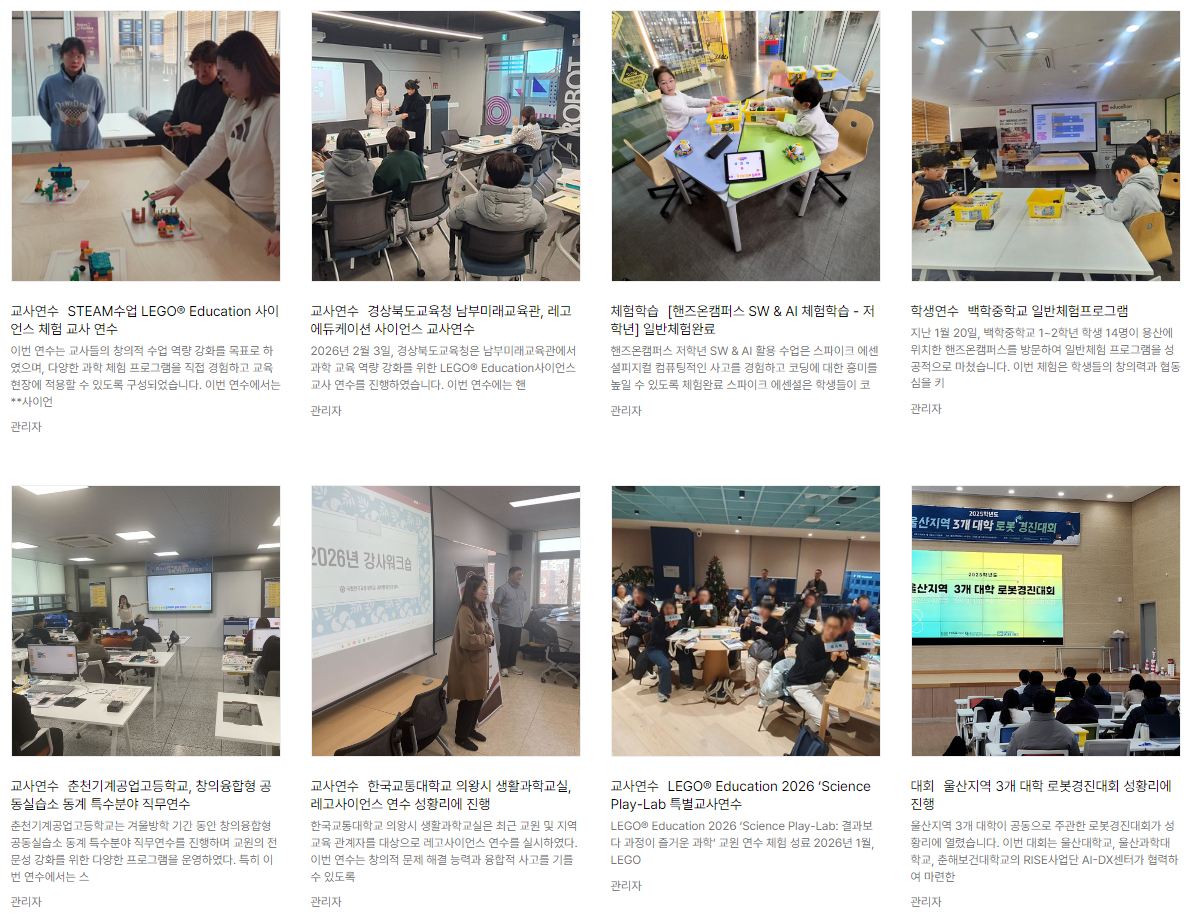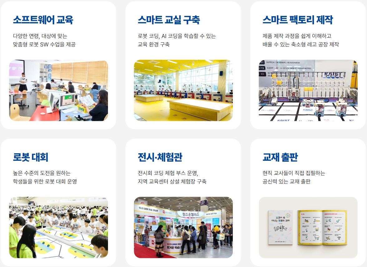 이밖에도 최적의 학습 환경을 제공하는 학교 맞춤형 ‘스마트 교실’ 구축을 지원하고, 학생들의 도전정신 함양을 위해 WRO(월드 로봇 올림피아드)를 비롯한 다양한 로봇 대회를 매년 실시하는 한편, 특강·교사연수·찾아가는 캠프 등을 통해 새로운 교육을 열망하는 학생 및 교사들과 적극적으로 소통하고 있습니다.