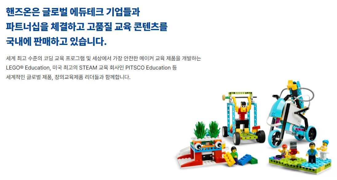 핸즈온은 2011년 LEGO® Education을 시작으로 세계 유수의 에듀테크 기업들과 공식 파트너십을 체결하고 초·중·고·대학교를 위한 다양한 솔루션을 제공하고 있으며, 2015년 서울 용산에 문을 연 로봇 코딩 체험관 ‘핸즈온캠퍼스’는 연간 3만 명 이상이 방문하는 로봇 코딩 체험 명소로 자리매김했습니다.