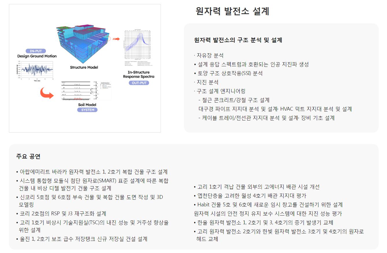 최고의 엔지니어링 전문가들과 함께, 당사는 주요 시설의 내진 성능 평가, 원자로 격납 건물의 구조적 안전성을 평가하기 위한 가동 중 검사, 그리고 원자력 발전소의 수리 및 보강 작업을 포함한 다양한 안전 관련 검사로 사업을 확장해 왔습니다.