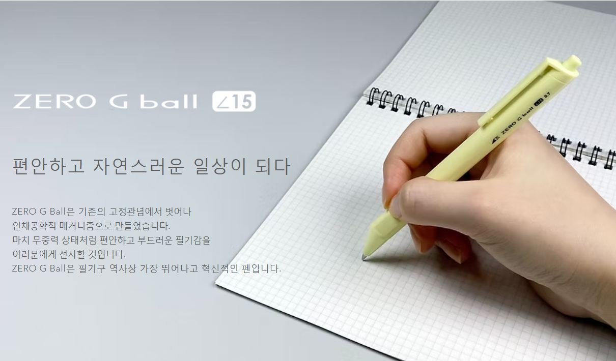 국내 필기구 업계 전문가들과의 협업을 통해 개발된 ZERO G ball은 세계 필기구 시장의 패러다임을 바꾼다는 의지를 가지고 탄생하였습니다.